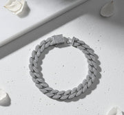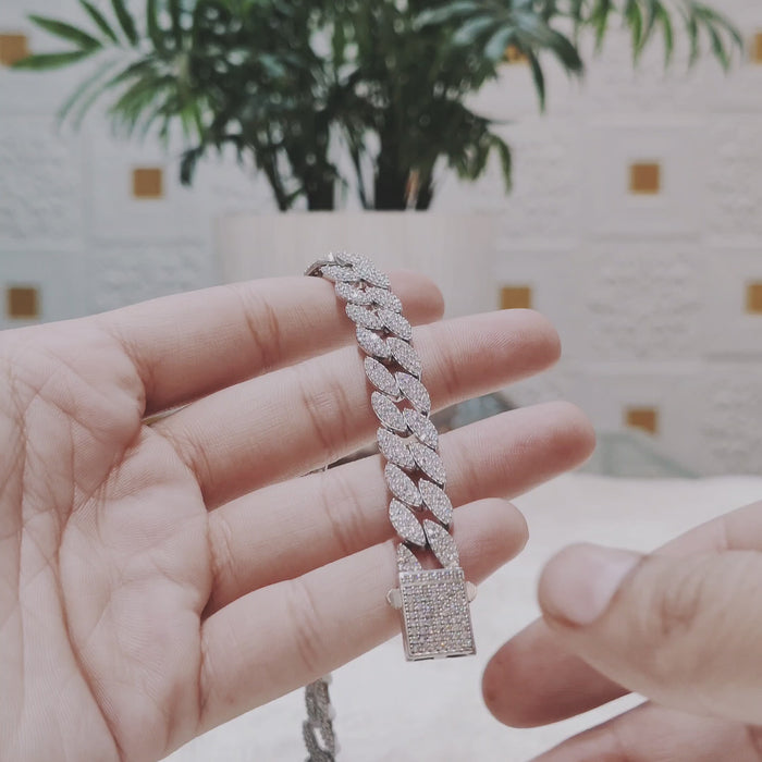 Crafted in high-quality silver, the bracelet features classic Cuban links fully embellished with precision-set stones that catch the light from every angle. Each link is polished to perfection, giving it a luxurious shine and a premium feel. The secure clasp ensures a comfortable fit while maintaining the sleek, high-end look. Stylish, durable, and eye-catching—this piece is made to elevate everyday wear and special occasions.