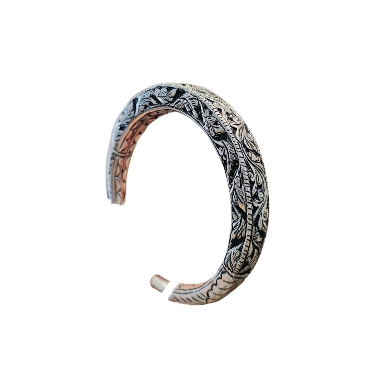 Handcrafted in pure silver, this open bangle features intricate hand-engraved leaf and vine motifs that flow seamlessly across its curved surface. The oxidized finish enhances the depth of the detailing, giving it a vintage yet regal allure. Its sturdy yet elegant form ensures both comfort and sophistication, making it a versatile piece for everyday wear or special occasions.
