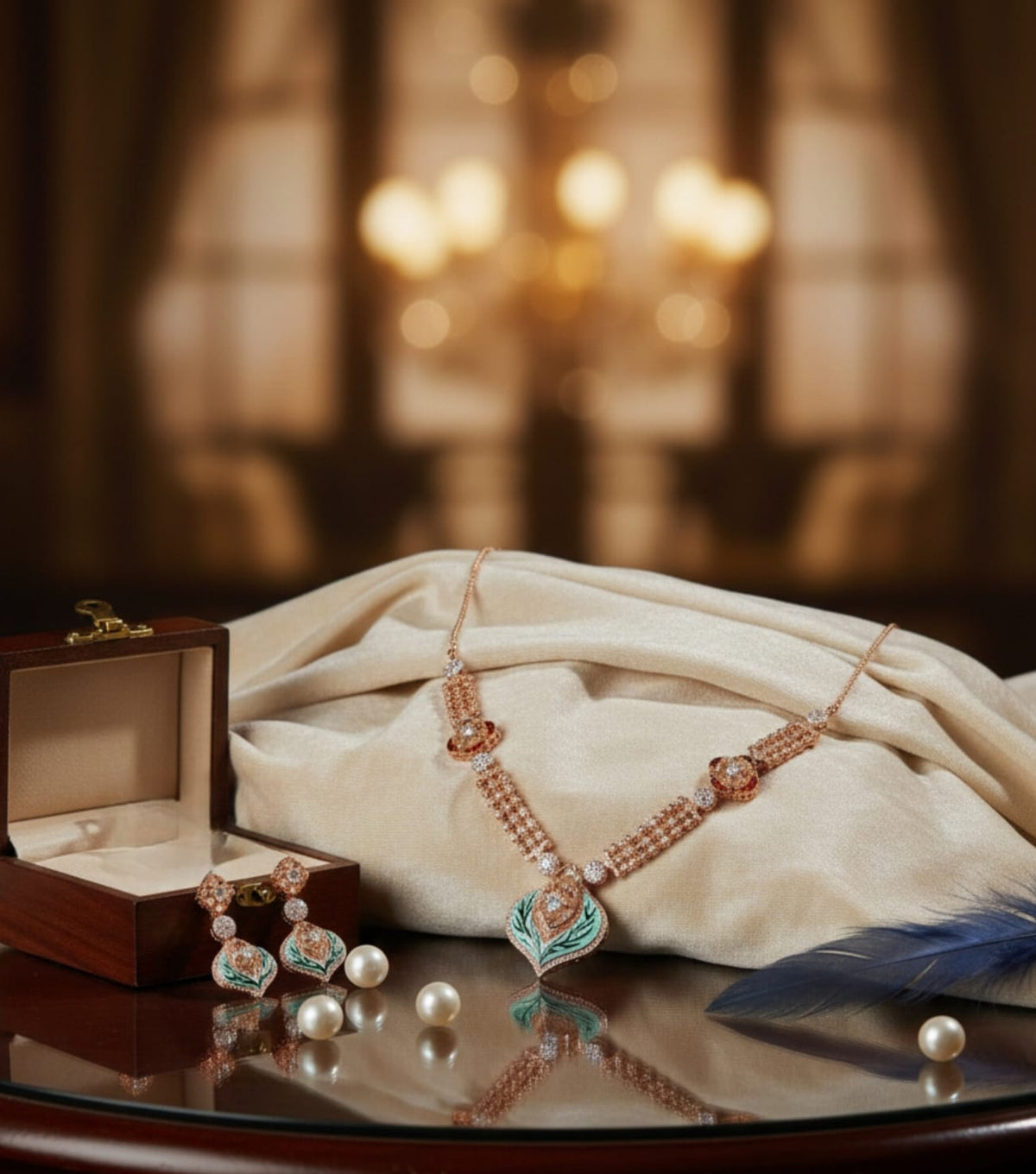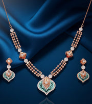 This necklace set features a graceful rose gold design, adorned with shimmering stones and delicate green enamel leaf motifs. The triple-layered chain adds depth and elegance, complementing the nature-inspired pendant and matching earrings.