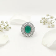 The centerpiece features a magnificent, smooth Oval-Cut Green Gemstone (such as high-grade Green Onyx or Agate), perfectly framed by a brilliant, multi-layered halo. This outer halo is intricately set with dazzling American Diamonds (CZ stones) in a unique Sunburst or Starburst pattern, using both round and baguette cuts to maximize fire and dimension.